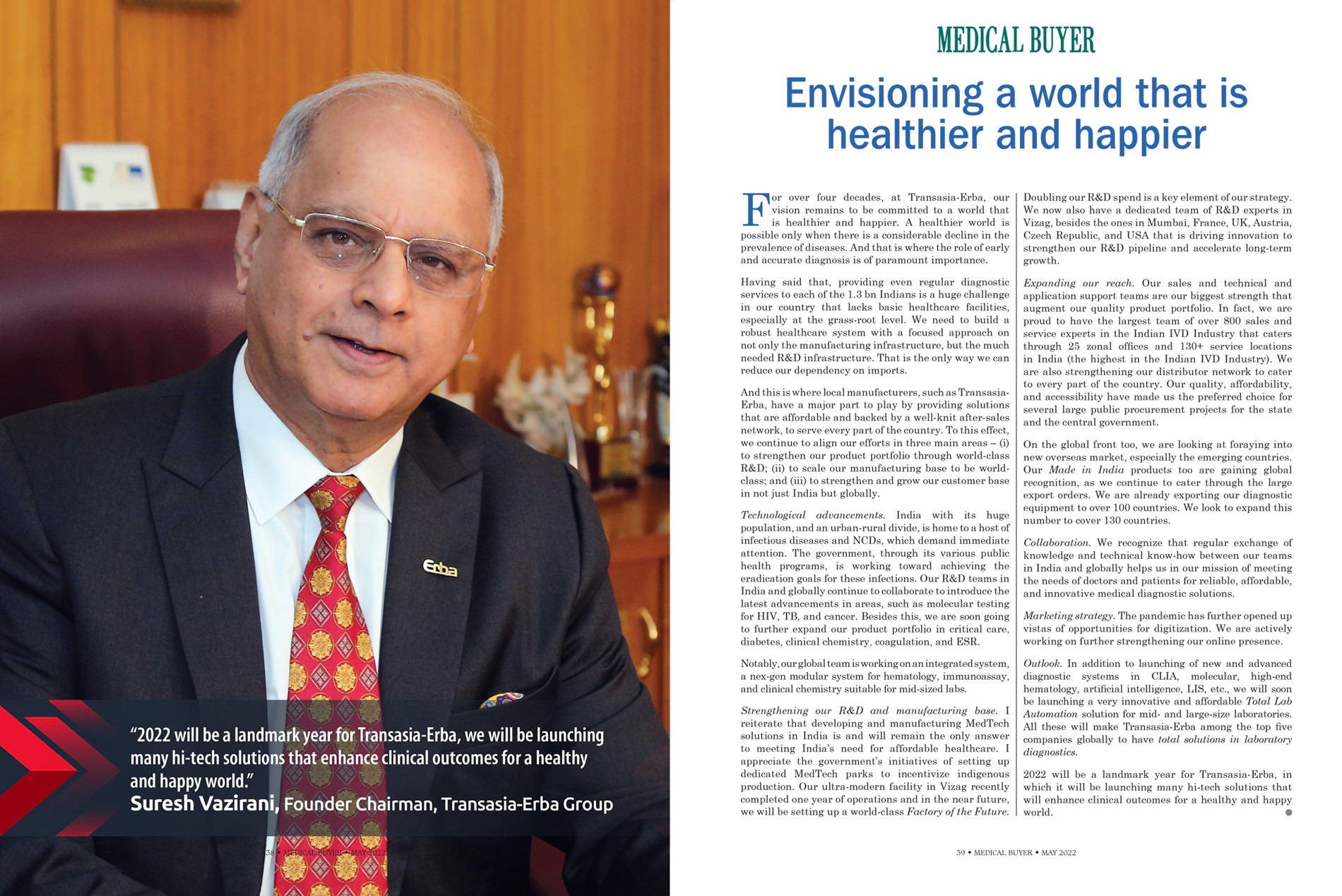Medical Buyer, May 2022: For over four decades, at Transasia-Erba, our vision remains to be committed to a world that is healthier and happier. A healthier world is possible only when there is a considerable decline in the prevalence of diseases. And that is where the role of early and accurate diagnosis is of paramount importance.